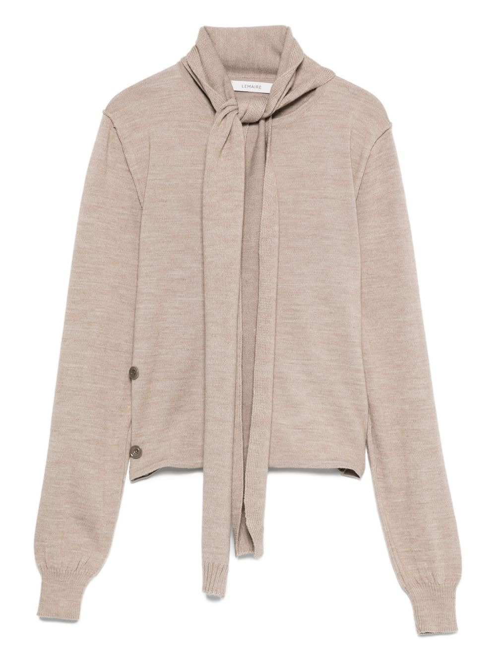 tied-neck button-detail top Highlights - Light taupe beige - Tied neck - Button details - Long sleeves - High neck - Straight hem Imported Composition Wool 50%, Acrylic 50% SIZE & FIT Model measurements Height 5 ft 9 in(1.76 m) Bust/Chest 32.28 in(82 cm) Hips 35.43 in(90 cm) Waist 25.19 in(64 cm) Washing instructions Hand Wash