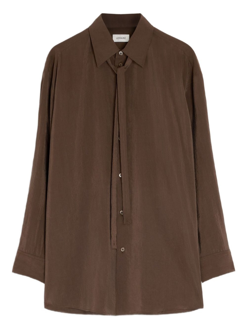 tied-neck shirt Highlights - Brown - Silk blend - Tied neck - Pointed collar - Front button closure - Long sleeves - Buttoned cuffs Imported Composition Silk 76%, Nylon 24% Washing instructions Read Manufacturer Guidelines