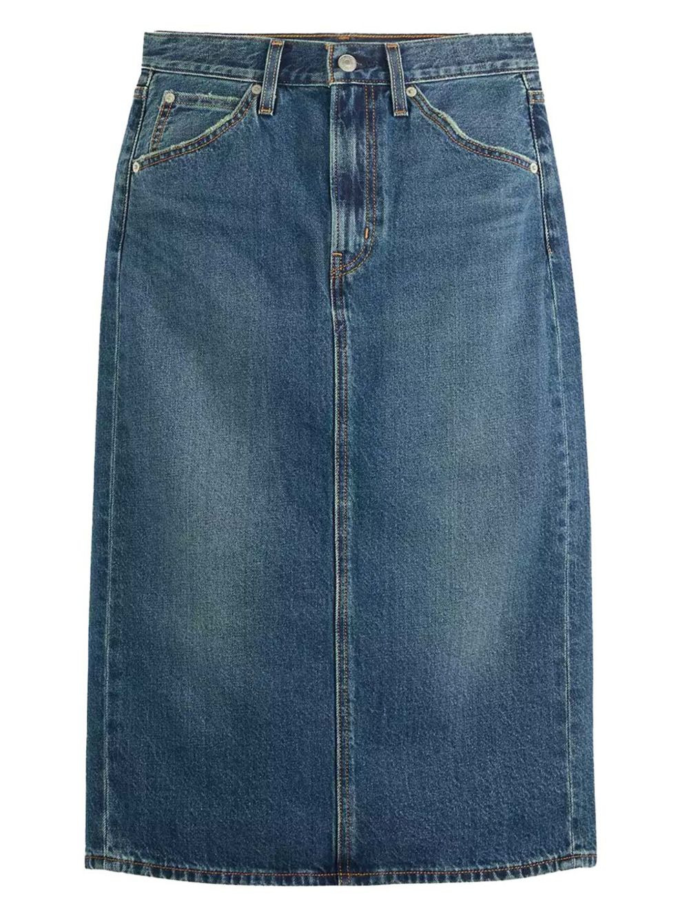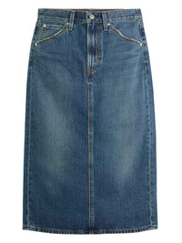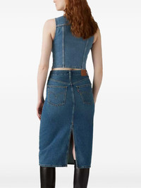 back-slit denim midi skirt