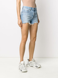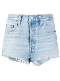 distressed denim shorts Light blue cotton distressed denim shorts from Levi's featuring a stonewashed effect, distressed effects, a waistband with belt loops, a branded rear patch, a front button fastening and a five pocket design. Imported Composition Cotton 100% SIZE & FIT Model measurements Height 5 ft 11 in(1.8 m) Bust/Chest 33.07 in(84 cm) Hips 37.4 in(95 cm) Waist 25.19 in(64 cm) FittingInformation This piece fits true to size. We recommend you get your regular size Cut for a slim fit Made with a mid-weight non-stretch fabric