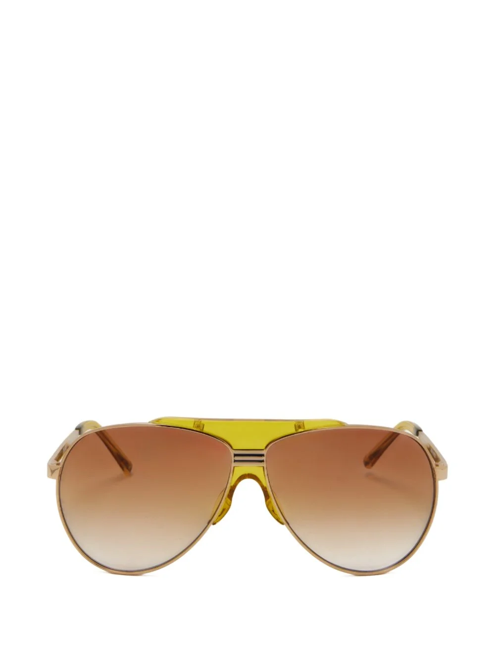 browline sunglasses Highlights - Yellow gold-tone - Browline frame - Tinted lenses - Nose pads - These glasses come with a protective case. Imported Composition Metal 100% SIZE & FIT Measurement Arm Length 5.7 in(14.5 cm) Bridge Width 0.43 in(1.1 cm) Lens Diameter 2.48 in(6.3 cm)