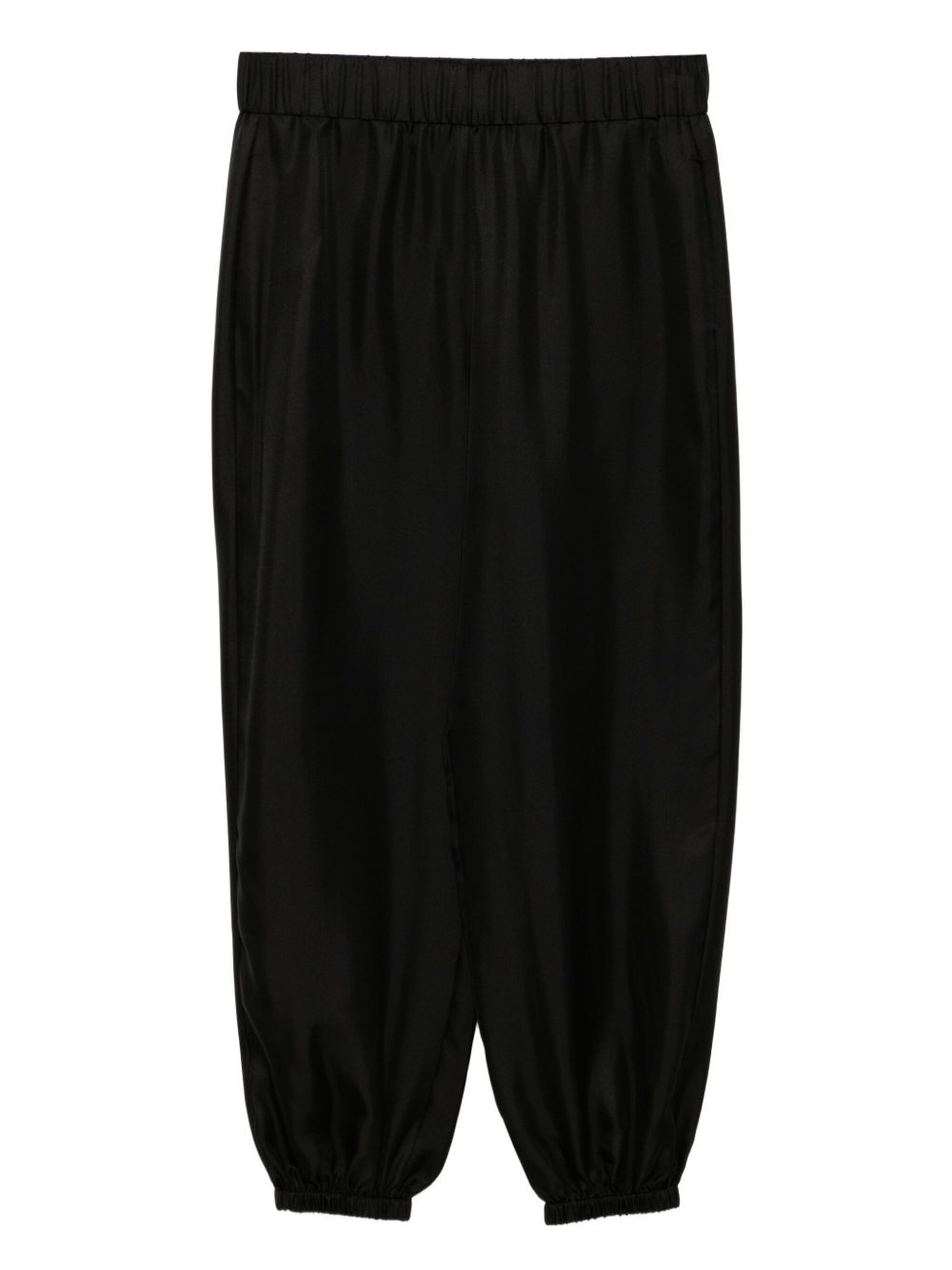 silk cropped trousers Highlights - Black - Elasticated band - Two side welt pockets Imported Composition Silk 100% SIZE & FIT Model measurements Height 5 ft 9 in(1.76 m) Bust/Chest 31.1 in(79 cm) Hips 35.03 in(89 cm) Waist 24.4 in(62 cm) FittingInformation Designed for a tapered fit, these trousers allow for a close fit at the waist and a loose unrestricted fit over the leg with a closer fit towards the ankle The elasticated hem at the ankle allows for movement and a comfortable fit Made from a midweight non-stretch fabric Washing instructions Dry Clean Only