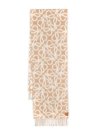 Anagram-jacquard fringed scarf Highlights - Beige/white - Alpaca wool-blend - Brushed finish - Signature jacquard anagram motif - Leather tag - Fringe detailing - Rectangle shape - Wraparound style Made in Italy Composition Calf Leather 100%, Alpaca 45%, Wool 34%, Polyamide 21% SIZE & FIT Measurement LENGTH 84.64 in(215 cm) WIDTH 13.77 in(35 cm)