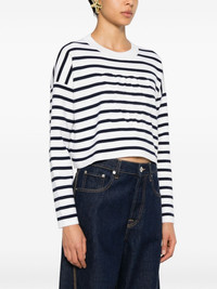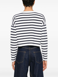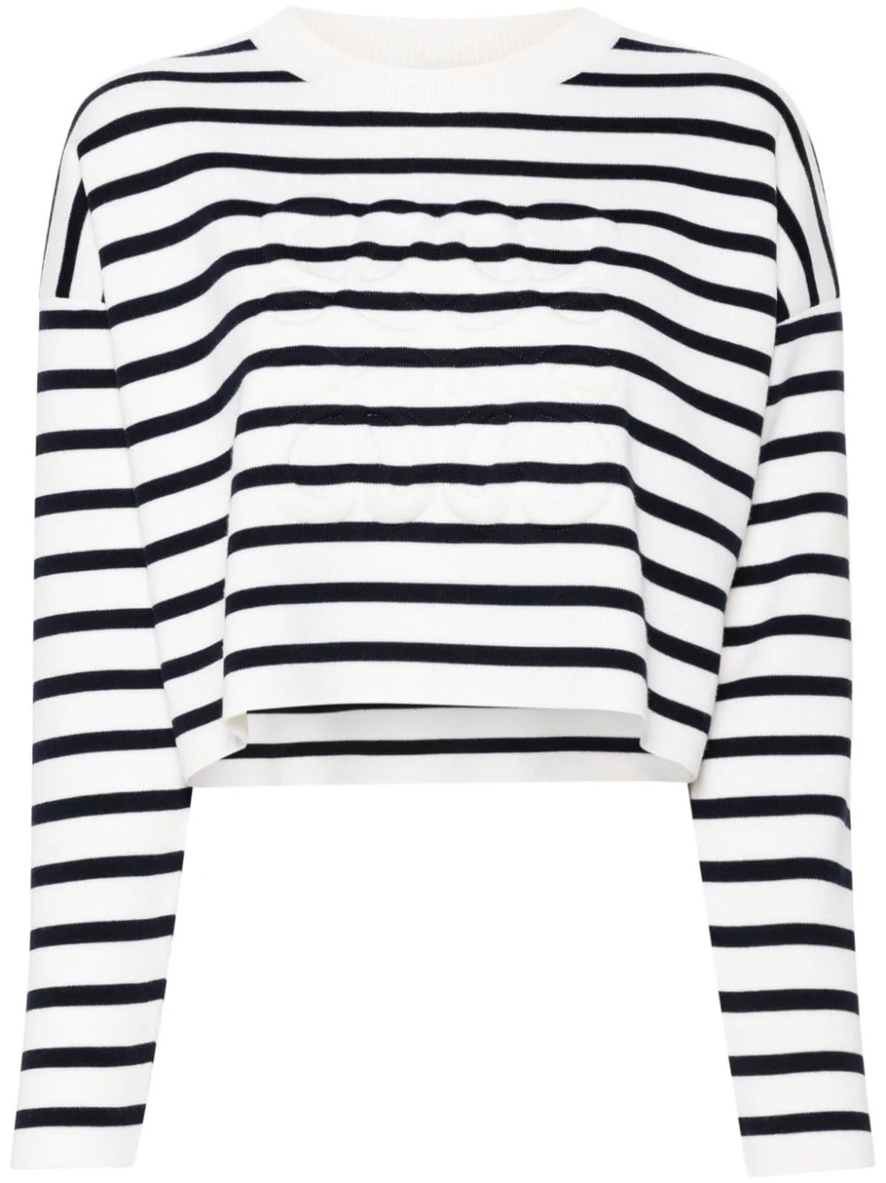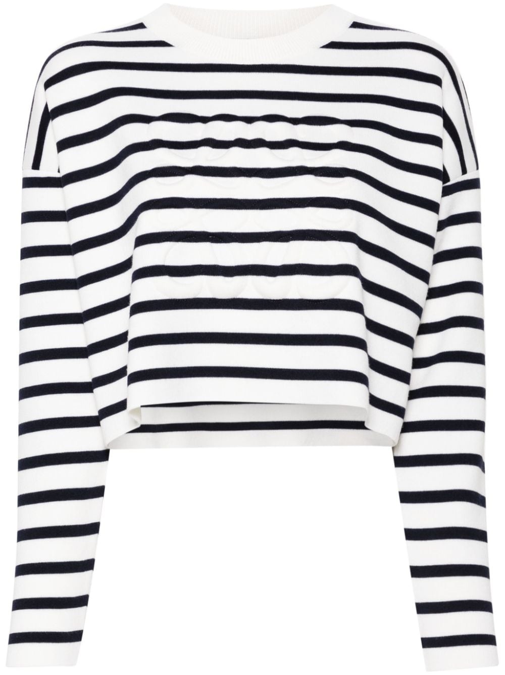Anagram-motif jumper Highlights - Off-white/navy blue - Wool blend - Knitted construction - Horizontal stripe pattern - Signature embossed anagram motif - Round neck - Long sleeves - Cropped - Straight hem Made in Italy Composition Outer: Wool 96%, Polyamide 4%, Spandex/Elastane 1% Lining: Polyamide 80%, Spandex/Elastane 20% SIZE & FIT Model measurements Height 5 ft 9 in(1.76 m) Bust/Chest 31.88 in(81 cm) Hips 35.43 in(90 cm) Waist 24.8 in(63 cm) FittingInformation Designed to be unstructured, offering a loose fit throughout Made with a midweight knit, this piece offers some stretch This piece fits true to size – take your usual size