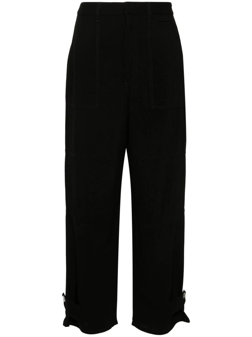 Anagram-tab tapered trousers Highlights - Black - Canvas - Belt loops - Two side patch pockets - Coin pocket - Dart detailing to the knee - Button-fastening straps - Full-length - Two rear welt pockets - Anagram embossed leather tab to the rear - Tapered leg - Concealed fly and button fastening Made in Italy Composition Outer: CALFSKIN 100%, Viscose 87%, Linen/Flax 13% Lining: Cotton 100% SIZE & FIT Model measurements Height 5 ft 10 in(1.78 m) Bust/Chest 32.67 in(83 cm) Hips 35.43 in(90 cm) Waist 23.22 in(59 cm) FittingInformation Designed for a straight-leg fit, these trousers allow for a close fit at the waist and an unrestricted, comfortable fit over the leg The adjustable tabs allow for fitted preferences Made from a midweight non-stretch fabric This piece fits true to size – take your usual size Washing instructions Dry Clean Only