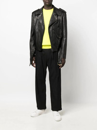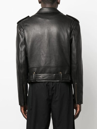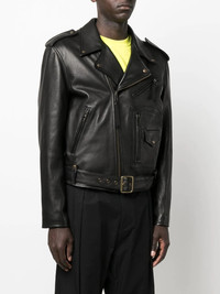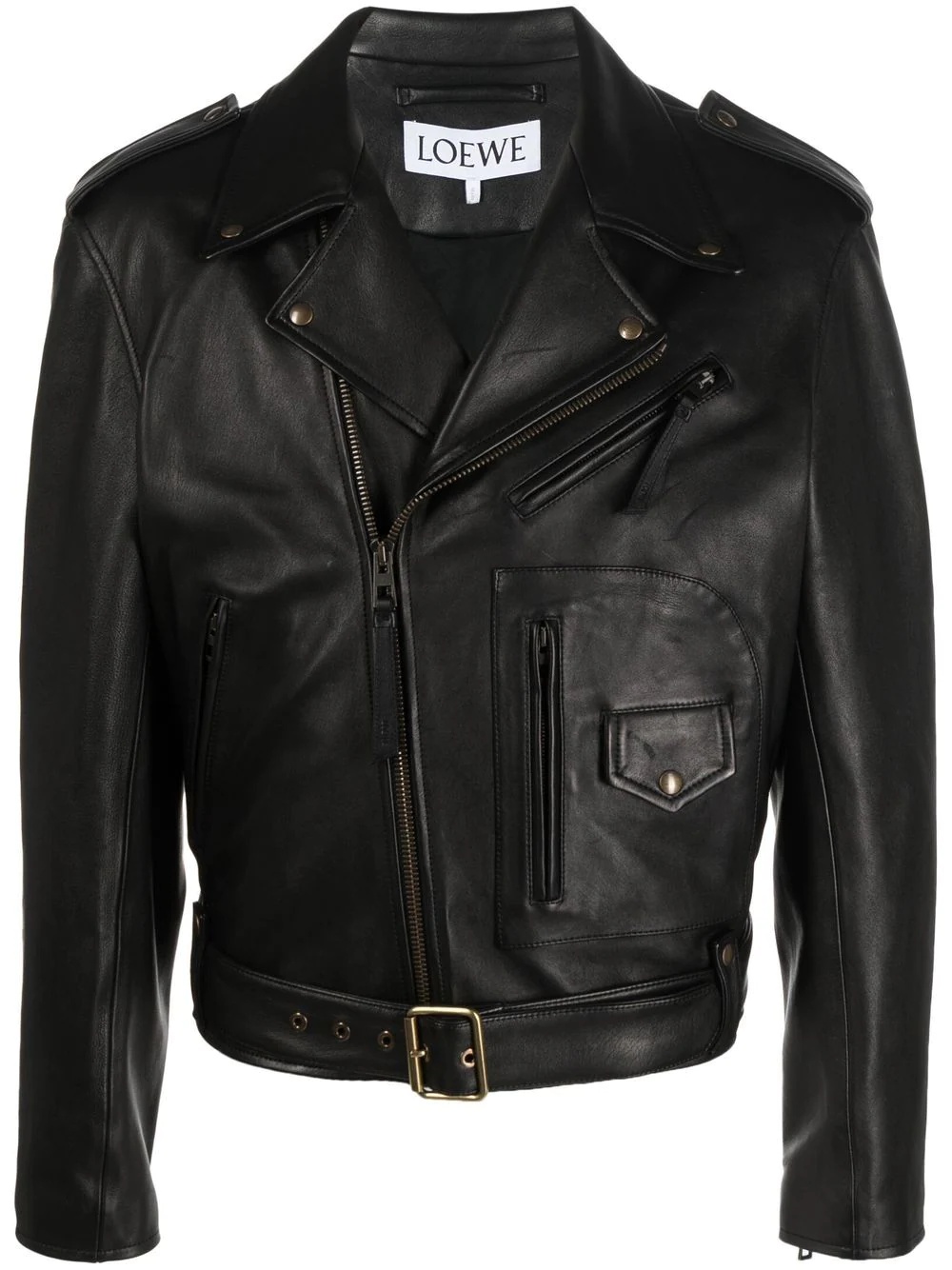 belted leather biker jacket belted leather biker jacket from LOEWE featuring black, lambskin, notched lapels, long sleeves, front zip fastening, long sleeves and belted waist. Imported Composition Outer: CALFSKIN 100%, Lamb Skin 100% Lining: Cotton 100%, Polyester 95%, Viscose 53%, Cupro 47%, Polyamide 5% SIZE & FIT Model measurements Height 6 ft 2 in(1.87 m) Bust/Chest 36.41 in(92.5 cm) Hips 37 in(94 cm) Waist 29.52 in(75 cm) FittingInformation This piece fits true to size. We recommend you get your regular size Cut for a loose fit Made with a mid-weight fabric Washing instructions Specialist Cleaning