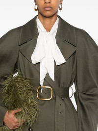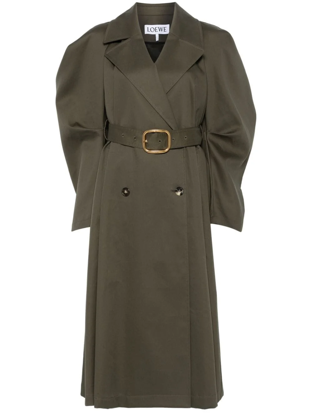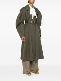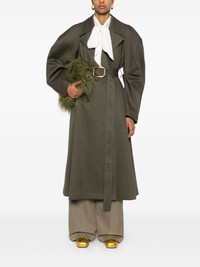 belted trench coat Highlights - Olive green - Cotton - Interlock twill weave - Double-breasted button fastening - Wide notched lapels - Long voluminous sleeves - Dart detailing - Belted waist - Two side welt pockets - Central rear vent - Straight hem - Mid-rise Made in Italy Composition Lining: Cotton 100%, Viscose 100%, CALFSKIN 100% Outer: Cotton 100% SIZE & FIT Model measurements Height 5 ft 10 in(1.77 m) Bust/Chest 33.07 in(84 cm) Hips 37 in(94 cm) Waist 24.8 in(63 cm) FittingInformation Designed to be unstructured, offering a loose fit throughout The belt offers adjustability for fitted preferences Made from a midweight non-stretch fabric Washing instructions Machine Wash
