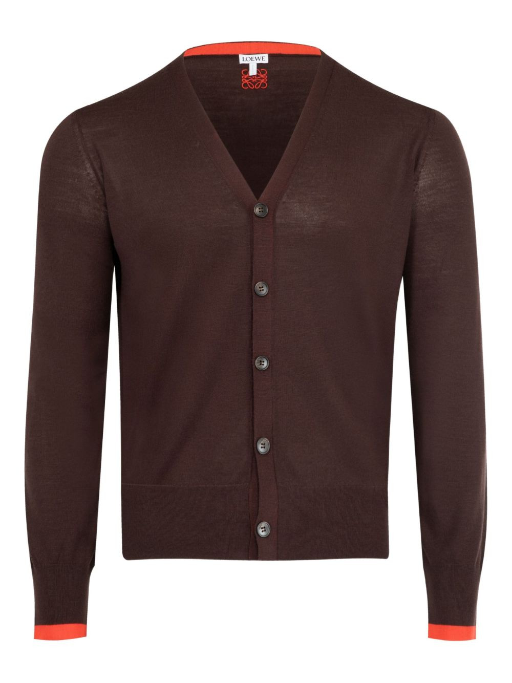 buttoned V-neck cardigan Highlights - Dark brown - V-neck - Button fastening - Long sleeves - Ribbed cuffs - Logo detail Made in Italy Composition Wool 100% Washing instructions Read Manufacturer Guidelines