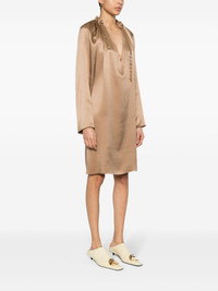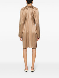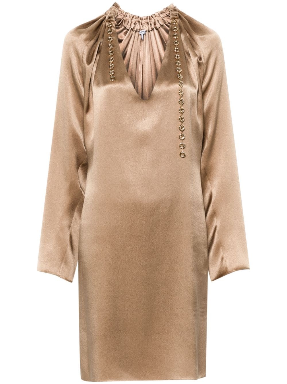 chain-detail silk mini dress Highlights - Light brown - Silk - Satin weave - Gathered neckline with gold tone chain detail - V-neck - Long raglan sleeves - Side slits - Slip-on style Made in Italy Composition Silk 100% SIZE & FIT Model measurements Height 5 ft 9 in(1.76 m) Bust/Chest 31.88 in(81 cm) Hips 35.43 in(90 cm) Waist 24.8 in(63 cm) FittingInformation Designed for a relaxed fit, this piece allows for comfort and movement when worn Made from a midweight non-stretch fabric This piece fits true to size – take your usual size