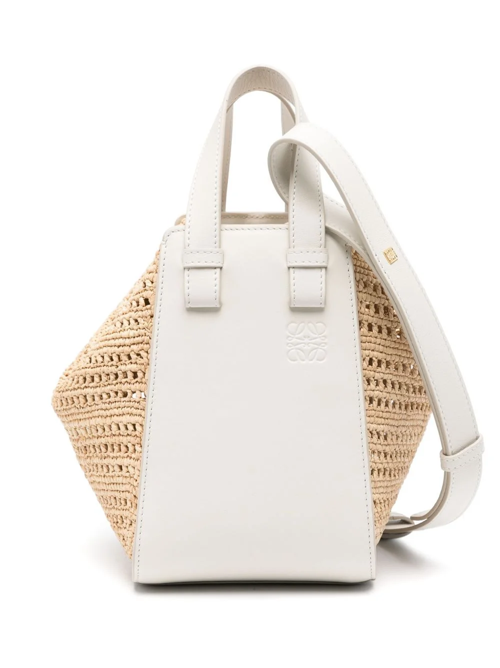 Compact Hammock tote bag Highlights - Off-white/light beige - Woven raffia design - Leather trim - Two flat top handles - Adjustable detachable shoulder strap - Signature anagram plaque - Main compartment - Unlined - Magnetic fastening - This piece comes complete with a protective dust bag. Imported Composition Outer: Raffia 100%, Calf Leather 100% SIZE & FIT Measurement DEPTH 5.9 in(15 cm) HEIGHT 7.87 in(20 cm) STRAP 45.66 in(116 cm) WIDTH 9.84 in(25 cm) HANDLE 3.93 in(10 cm)