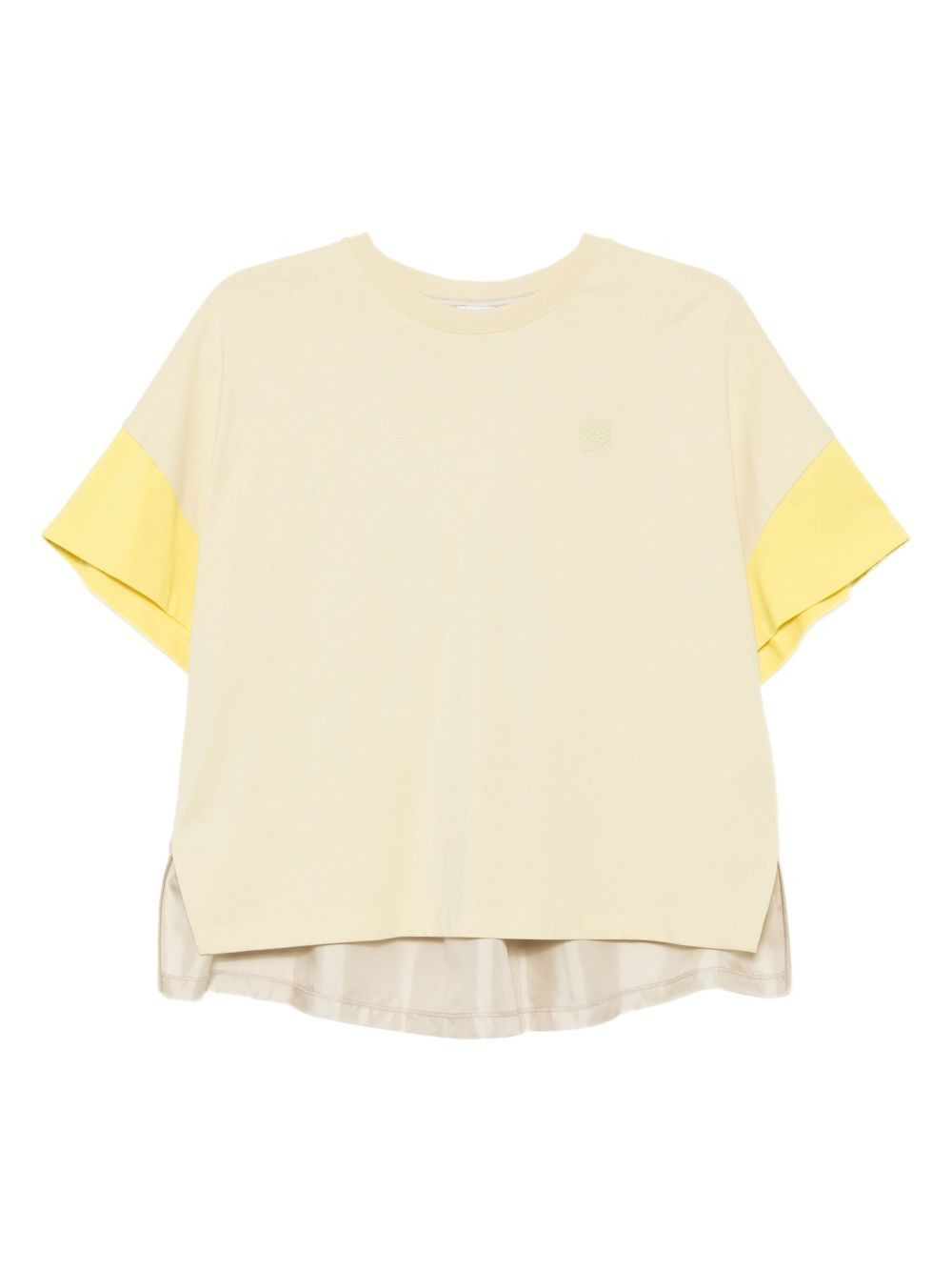 logoed cotton and silk t-shirt Highlights - Light yellow - Crew neck - Short sleeves - Short side slits - High-low hem Imported Composition Cotton 100% SIZE & FIT Model measurements Height 5 ft 10 in(1.79 m) Bust/Chest 29.52 in(75 cm) Hips 35.03 in(89 cm) Waist 24.01 in(61 cm) FittingInformation Designed for a relaxed fit, this piece allows for comfort and movement when worn Made from a midweight non-stretch fabric, this piece offers minimal elasticity when worn Washing instructions Dry Clean Only