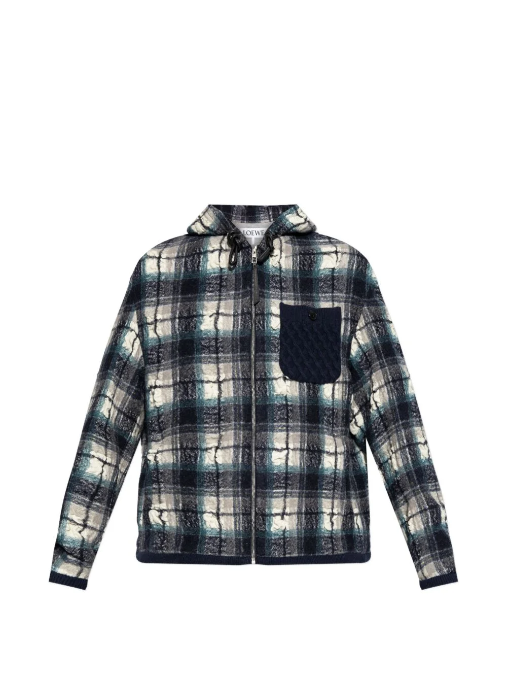 plaid pocket hooded jacket Highlights - Navy blue and ivory - Plaid pattern - Hooded - Zip fastening - Chest pocket Made in Italy Composition Wool 100% Washing instructions Read Manufacturer Guidelines