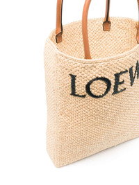 A4 raffia tote bag LOEWE’s Standard A4 tote bag is both ‘simple and striking’. Woven from neutral beige raffia, it’s contrasted with brown leather top handles and black logo embroidery. Highlights - Beige - Woven raffia design - Embroidered logo to the front - Leather top handles - Open top - Main compartment Imported Composition Outer: CALFSKIN 100%, Raffia 95%, Viscose 5% SIZE & FIT Model measurements Height 5 ft 10 in(1.79 m) Bust/Chest 31.1 in(79 cm) Hips 35.03 in(89 cm) Waist 24.01 in(61 cm) Measurement DEPTH 3.14 in(8 cm) HANDLE 4.72 in(12 cm) HEIGHT 12.59 in(32 cm) STRAP 17.71 in(45 cm) WIDTH 11.41 in(29 cm)