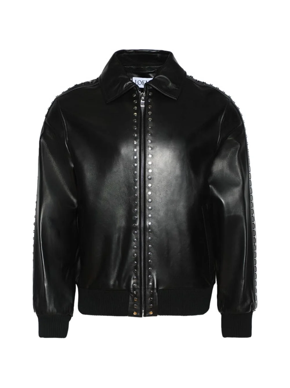 studded leather bomber jacket Highlights - Black - Studded detail - Zip fastening - Ribbed hem - Point collar - Long sleeves Imported Composition Lambskin 100% Washing instructions Read Manufacturer Guidelines
