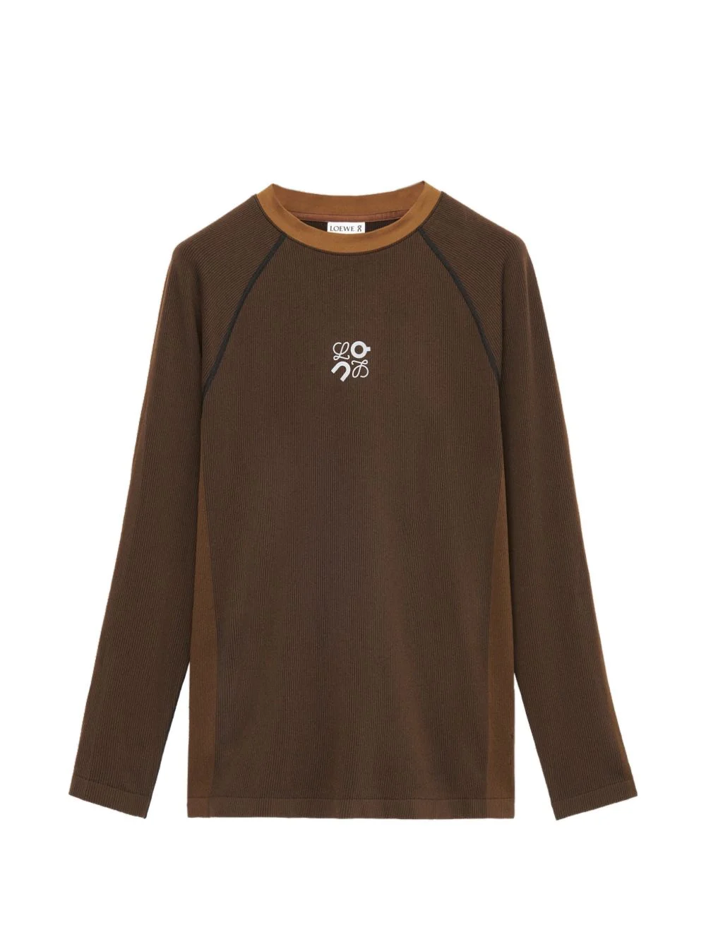 x On logo-print long-sleeve T-shirt Highlights - Brown - Ribbed texture - Logo detail - Round neck - Long sleeves - Contrast stitching Imported Composition Fabric 100% Washing instructions Read Manufacturer Guidelines