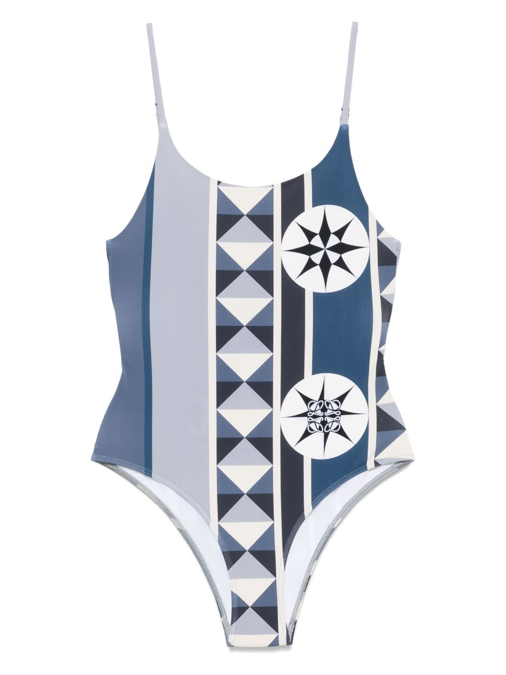 x Paula's Ibiza geometric-print swimsuit Highlights - Navy blue - Adjustable spaghetti straps - Scoop neck - Scoop back - Be mindful to try on swimwear over your own garments. Made in Italy Composition Outer: Polyamide 80%, Spandex/Elastane 20% Lining: Polyamide 75%, Spandex/Elastane 25% Washing instructions Machine Wash