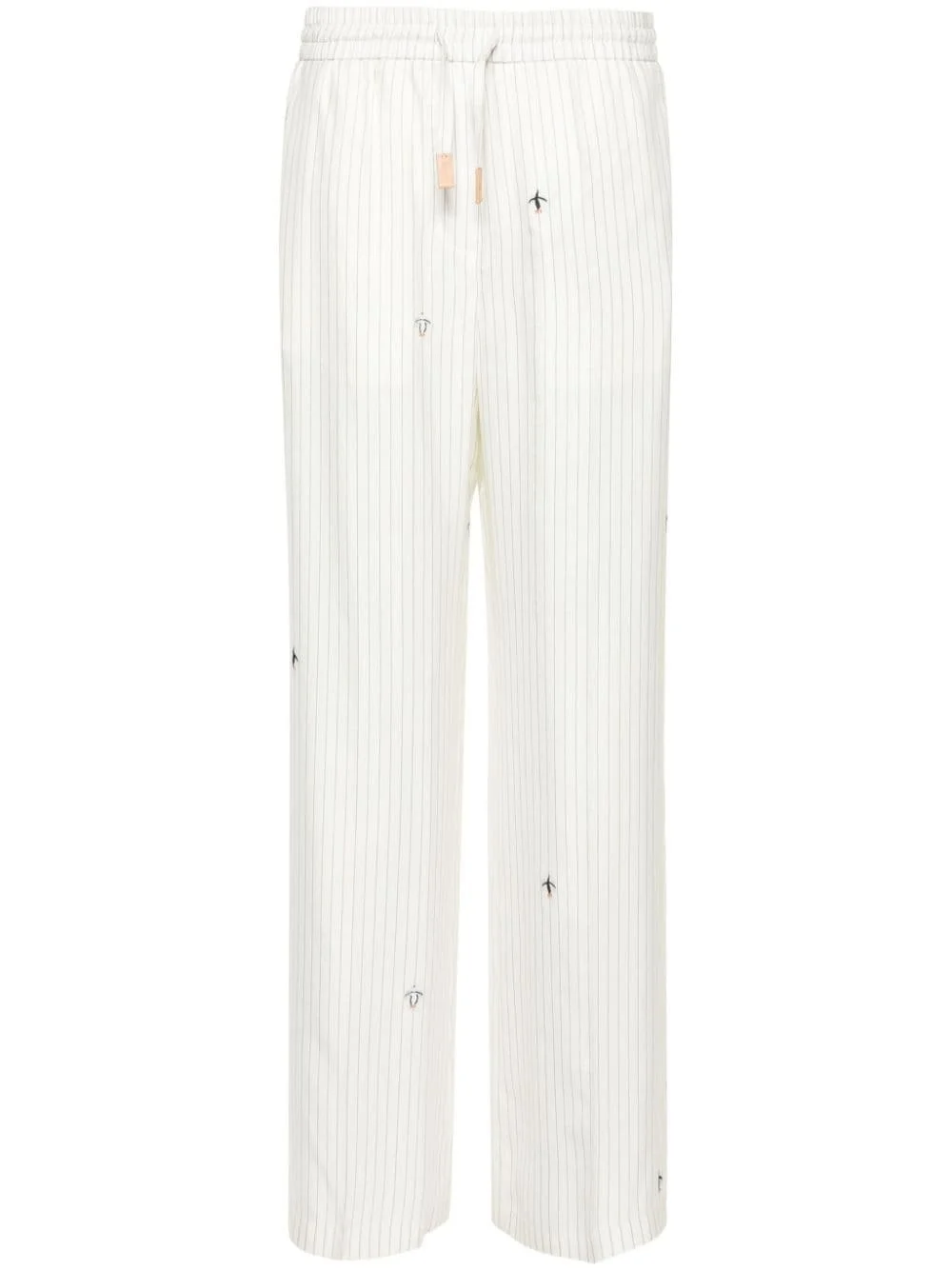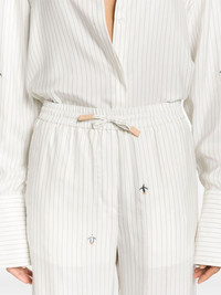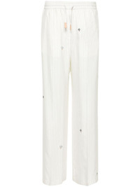 x Suna Fujita pinstriped trousers Highlights - White/grey - Silk blend - Pinstripe print - All-over motif embroidery - High-waisted - Elasticated drawstring waistband - Two side slash pockets - Rear welt pocket - Wide leg Made in Italy Composition Lining: Viscose 53%, Cupro 47% Outer: Silk 95%, CALFSKIN 10%, Cotton 5% SIZE & FIT Model measurements Height 5 ft 10 in(1.78 m) Bust/Chest 33.07 in(84 cm) Hips 36.61 in(93 cm) Waist 24.8 in(63 cm) FittingInformation Designed for a straight-leg fit, these trousers allow for a close fit at the waist and an unrestricted, comfortable fit over the leg Adjust this piece’s waistband to your preference using the drawstring Made from a midweight non-stretch fabric This piece fits true to size – take your usual size Washing instructions Dry Clean Only