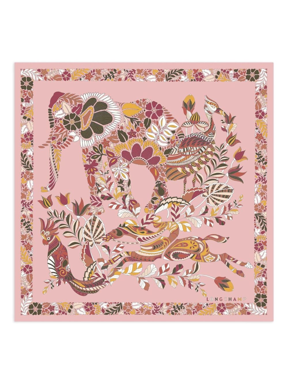 Foret silk scarf Highlights - Pink - Silk - Animal silhouettes - Floral pattern Made in France Composition Outer: Silk 100% SIZE & FIT Measurement LENGTH 19.68 in(50 cm) WIDTH 19.68 in(50 cm)