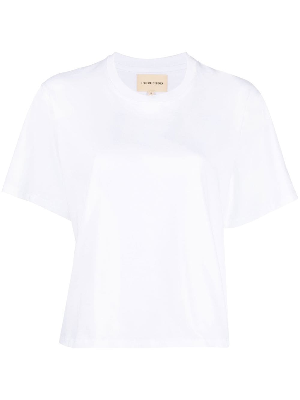 relaxed short-sleeve T-shirt relaxed short-sleeve T-shirt from Loulou Studio featuring white, cotton, crew neck, short sleeves and straight hem. Imported Composition Pima Cotton 100% SIZE & FIT Model measurements Height 5 ft 10 in(1.78 m) Bust/Chest 31.49 in(80 cm) Hips 37 in(94 cm) Waist 23.62 in(60 cm) Measurement SLEEVE LENGTH 7.87 in(20 cm) LENGTH 22.04 in(56 cm) BUST 39.37 in(100 cm) Shoulder Width 16.14 in(41 cm) FittingInformation This piece fits true to size. We recommend you get your regular size Cut for a loose fit Made with a mid-weight fabric Washing instructions Machine Wash