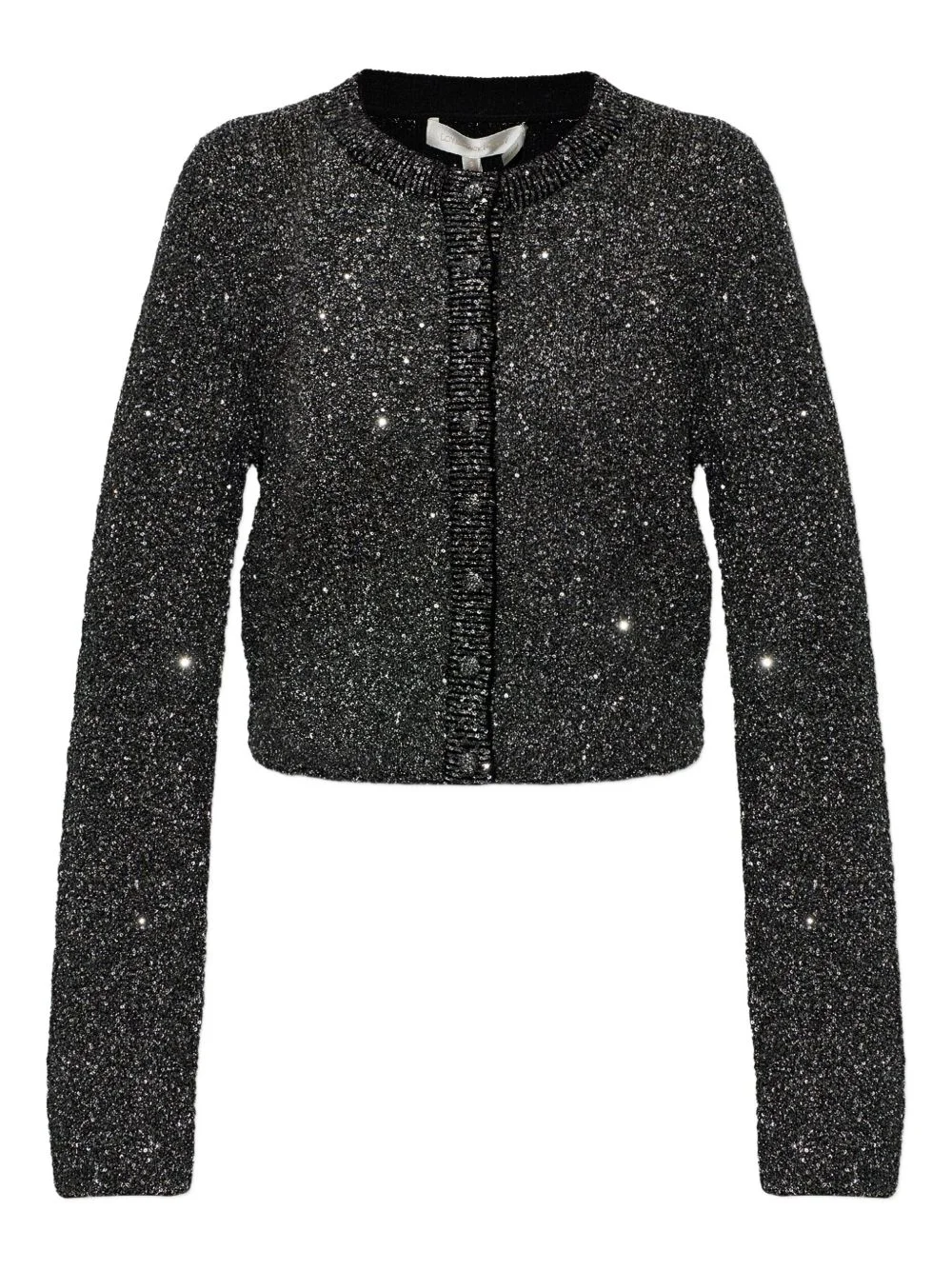 sequin-embellished cardigan Highlights - Black - Sequin embellishment - Round neck - Front button fastening - Long sleeves Imported Composition Lining: Viscose 82%, Polyester 18% Outer: Recycled Polyester 91%, Metallic Fibre 9% Washing instructions Hand Wash