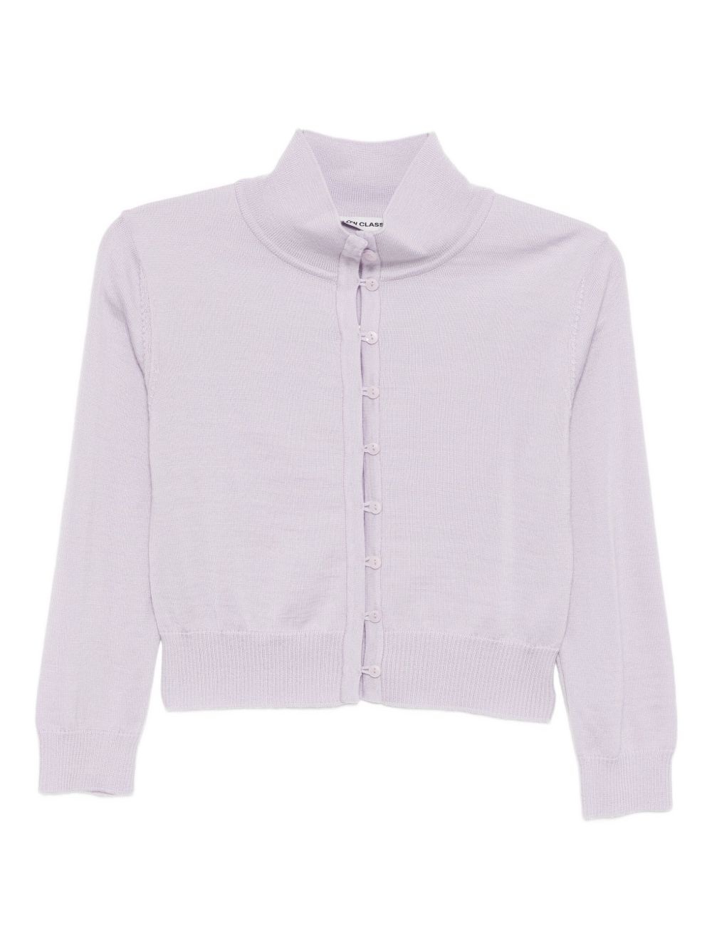 high neck cardigan Highlights - Lavender purple - Front button fastening - Long sleeves - Ribbed cuffs and hem Imported Composition Wool 100% Washing instructions Dry Clean Only