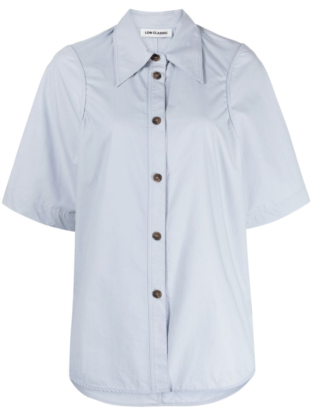 pointed-collar cotton shirt Highlights - Light blue - Cotton - Poplin texture - Oversized pointed collar - Front button fastening - Short sleeves - Curved hem Imported Composition Body: Cotton 100% SIZE & FIT Model measurements Height 6 ft 2 in(1.88 m) Bust/Chest 31.88 in(81 cm) Hips 35.82 in(91 cm) Waist 27.55 in(70 cm) FittingInformation Designed to be unstructured, offering a loose fit throughout Made from a midweight non-stretch fabric This piece fits true to size – take your usual size Washing instructions Dry Clean Only
