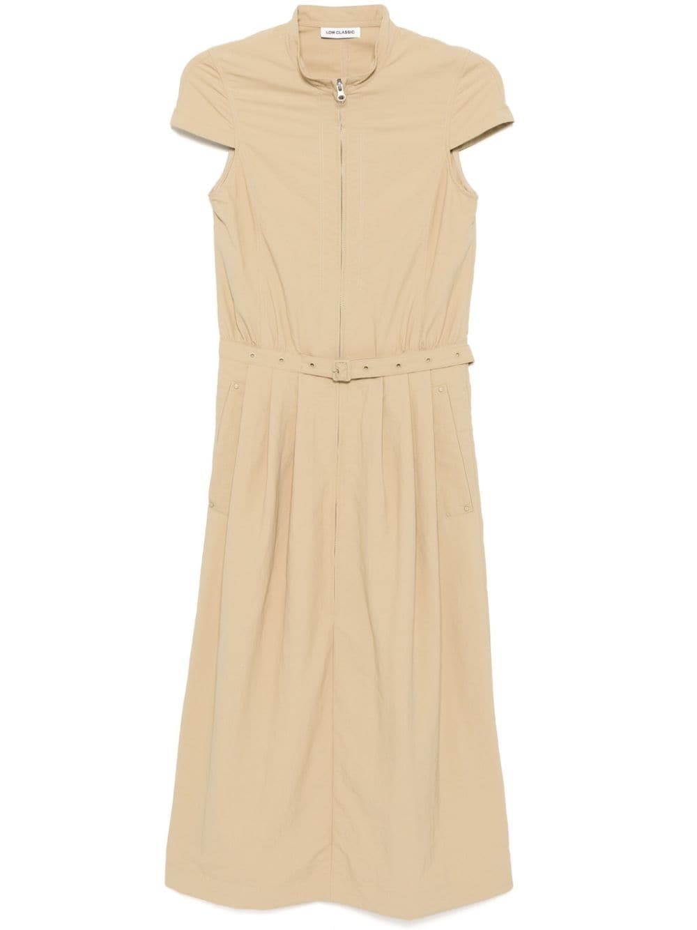 recycled-nylon high-neck dress Highlights - Sand beige - Recycled nylon - Front zip fastening - Adjustable waist strap - Pressed crease - Two side welt pockets - High neck - Short sleeves Imported Composition Recycled Nylon 100% SIZE & FIT FittingInformation Designed for a slim fit that sits just away from the body offering a close yet comfortable fit The belt offers adjustability for fitted preferences Made from a midweight non-stretch fabric