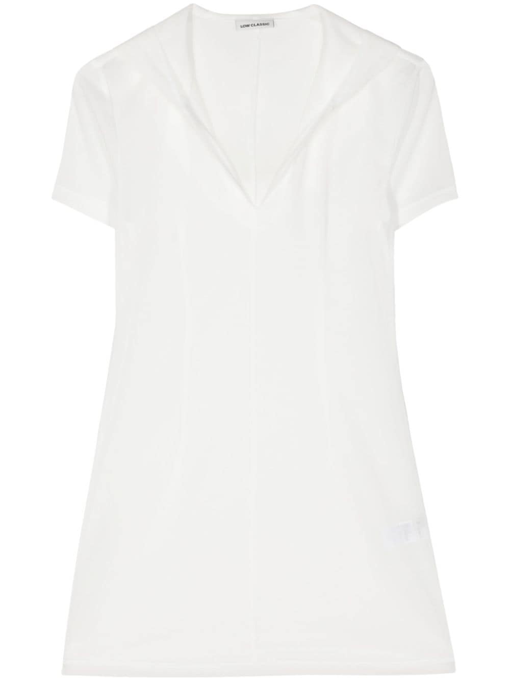 semi-sheer hoodie Highlights - White - Semi-sheer construction - Slouchy hood - V-neck - Short sleeves - Straight hem Imported Composition Polyester 100%