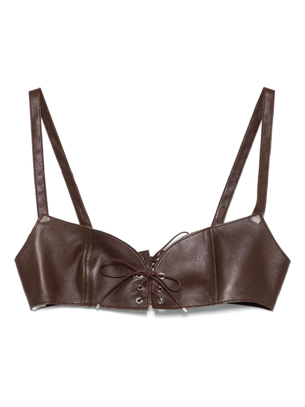 leather crop top Highlights - Brown - Front lace-up fastening - Sleeveless - Cropped Imported Composition Calf Leather 100% SIZE & FIT Model measurements Height 5 ft 11 in(1.8 m) Bust/Chest 31.49 in(80 cm) Hips 35.82 in(91 cm) Waist 24.8 in(63 cm) FittingInformation Designed for a very close and sculpting fit The adjustable shoulder straps allow for a preferred fit when worn Soft leather has a supple and smooth construction offering some flexibility