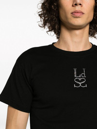 logo-embellished organic cotton T-shirt Ludovic de Saint Sernin presents this classic black T-shirt in organic cotton jersey. It's elevated with the label's iconic logo in glistening crystals. Highlights - Black - Organic cotton - Crystal embellishment - Crew neck - Short sleeves - Straight hem - When buying this unisex item, keep in mind that it is graded in standard men's sizing. Imported Composition Organic Cotton 100% SIZE & FIT Model measurements Height 5 ft 10 in(1.79 m) Bust/Chest 32.67 in(83 cm) Hips 34.25 in(87 cm) Waist 24.4 in(62 cm) FittingInformation This unisex piece is designed for a slim fit whether you usually select women's or men's sizes Made from a midweight non-stretch fabric, this piece offers minimal elasticity when worn Washing instructions Machine Wash