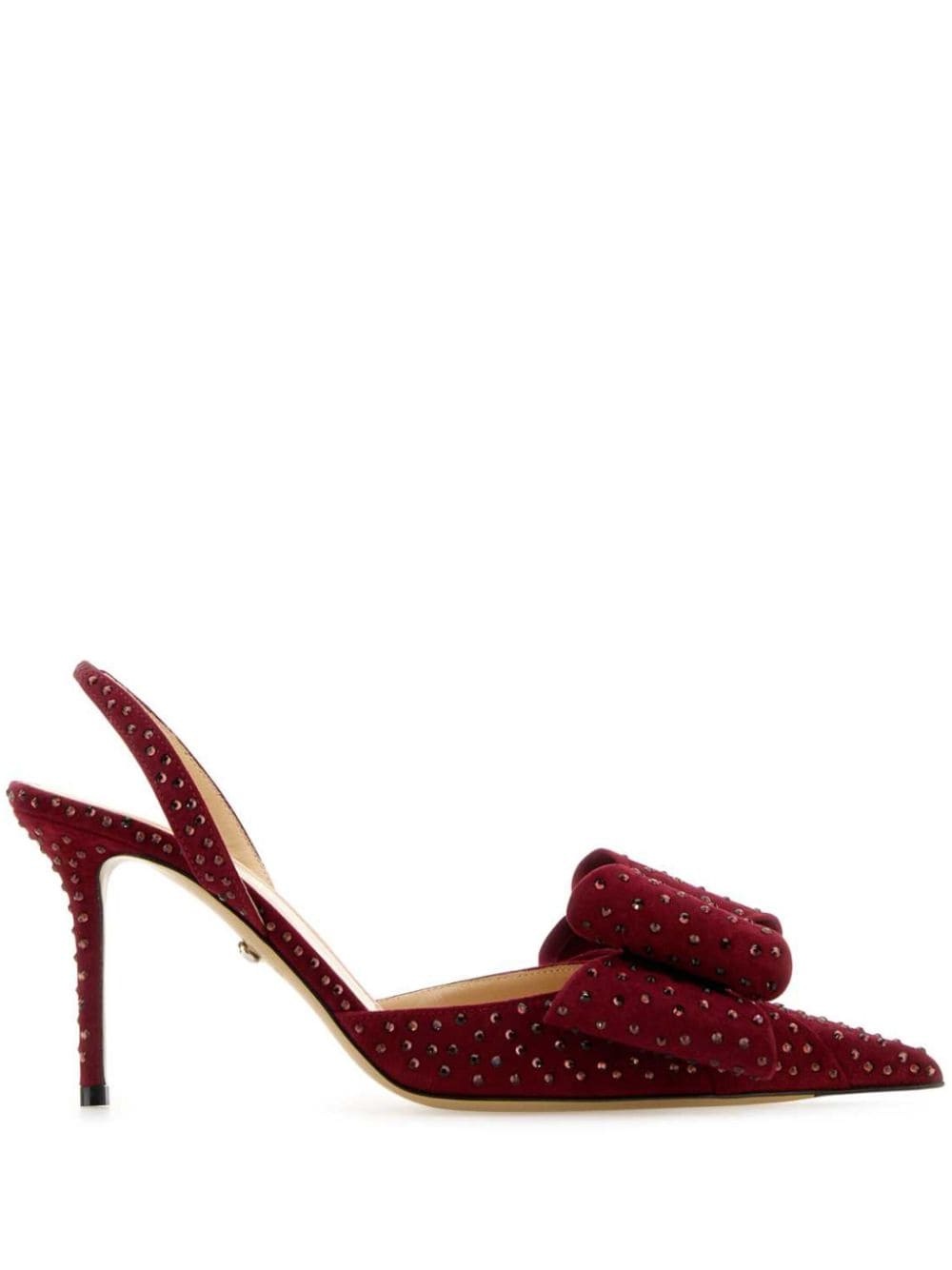 85mm suede pumps Highlights - Burgundy - Suede - Elasticated slingback strap - 85mm stiletto heel - Bow detailing - Sequin embellishment - Pointed toe - Branded leather insole - Leather sole Made in Italy Composition Suede 100% SIZE & FIT Measurement HEEL 3.34 in(8.5 cm)
