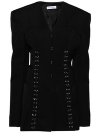 corset hook-and-eye wool mini dress Highlights - Black - Wool - Corset style - Lace detailing - Panelled design - V-neck - Front hook and eye fastening - Shoulder pads - Long sleeves - Straight hem - Thigh-length - Satin lining Made in Italy Composition Lining: Cupro 100% Outer: Wool 100%