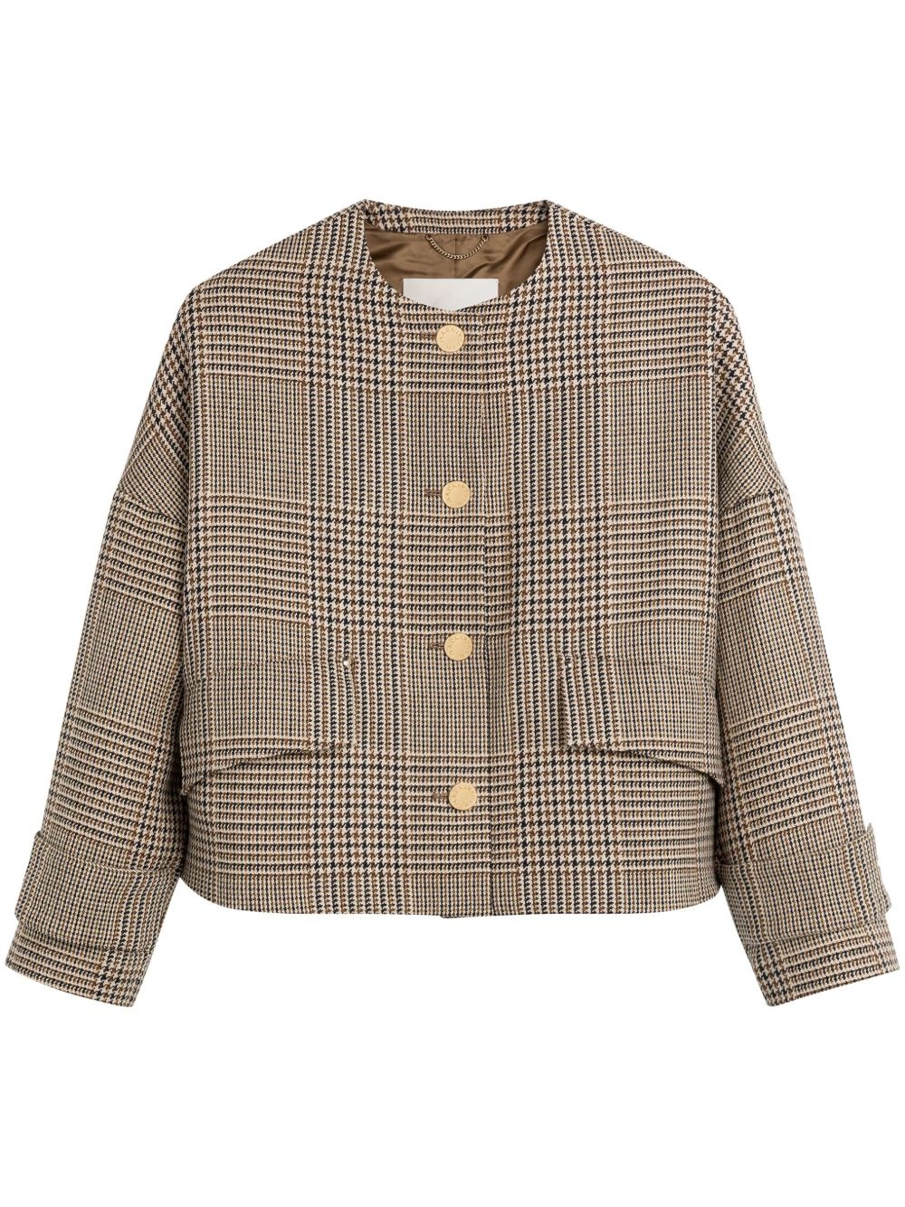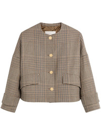 Humbie jacket Highlights - Camel brown - Wool - Check pattern - A-line - Rounded collar - Front button fastening - Belted cuffs - Two side flap pockets Imported Composition Outer: Wool 100% Lining: Cupro 100% SIZE & FIT Measurement LENGTH 21.25 in(54 cm) BUST 50.78 in(129 cm) Shoulder Width 29.13 in(74 cm)