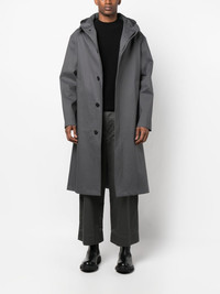 Wolfson hooded raincoat Highlights - Cool grey - Cotton - Water-repellent - Concealed front button fastening - Long sleeves - Drawstring hood - Two side welt pockets - Below-knee length Made in United Kingdom Composition Cotton 100% SIZE & FIT Model measurements Height 6 ft 2 in(1.88 m) Bust/Chest 35.03 in(89 cm) Hips 35.82 in(91 cm) Waist 27.95 in(71 cm) Measurement CHEST 52.75 in(134 cm) SLEEVE LENGTH 25.78 in(65.5 cm) Shoulder Width 21.25 in(54 cm) LENGTH 47.83 in(121.5 cm) WAIST 55.11 in(140 cm) FittingInformation Designed for a slim fit, offering a comfortable fit that sits just away from the body Made from a midweight non-stretch fabric, this piece offers minimal elasticity when worn This piece fits true to size – take your usual size Washing instructions Dry Clean Only