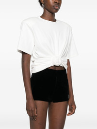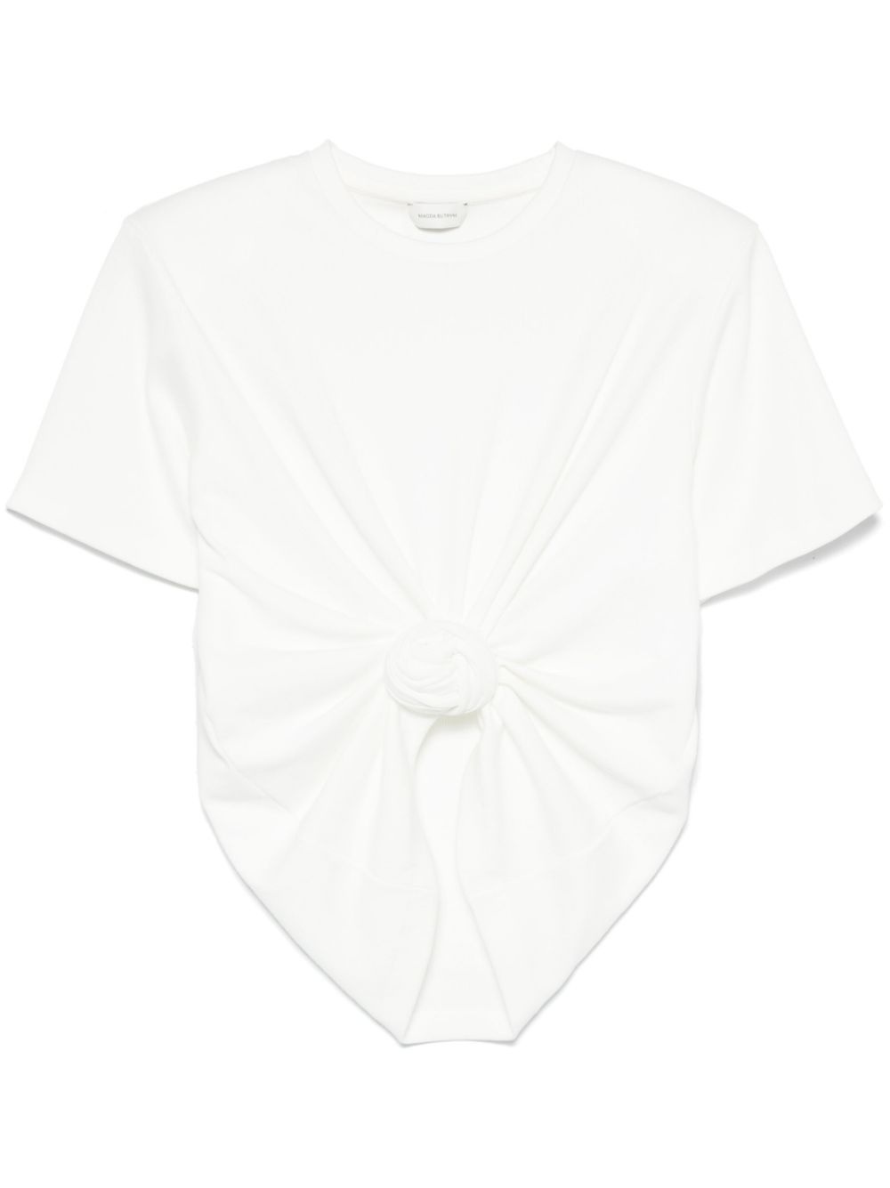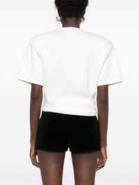 crew-neck T-shirt Highlights - White - Shoulder pads - Crew neck - Short sleeves Imported Composition Outer: Cotton 95%, Spandex/Elastane 5% Lining: Cotton 100% SIZE & FIT Model measurements Height 5 ft 11 in(1.8 m) Bust/Chest 32.67 in(83 cm) Hips 36.22 in(92 cm) Waist 24.4 in(62 cm) Measurement CHEST 33.85 in(86 cm) LENGTH 21.25 in(54 cm) WAIST 24.4 in(62 cm) FittingInformation Designed for a boxy fit, intended for a loose fit throughout The internal shoulder pads offer a structured shape Made from a midweight stretch fabric, this piece offers elasticity and flexibility when worn
