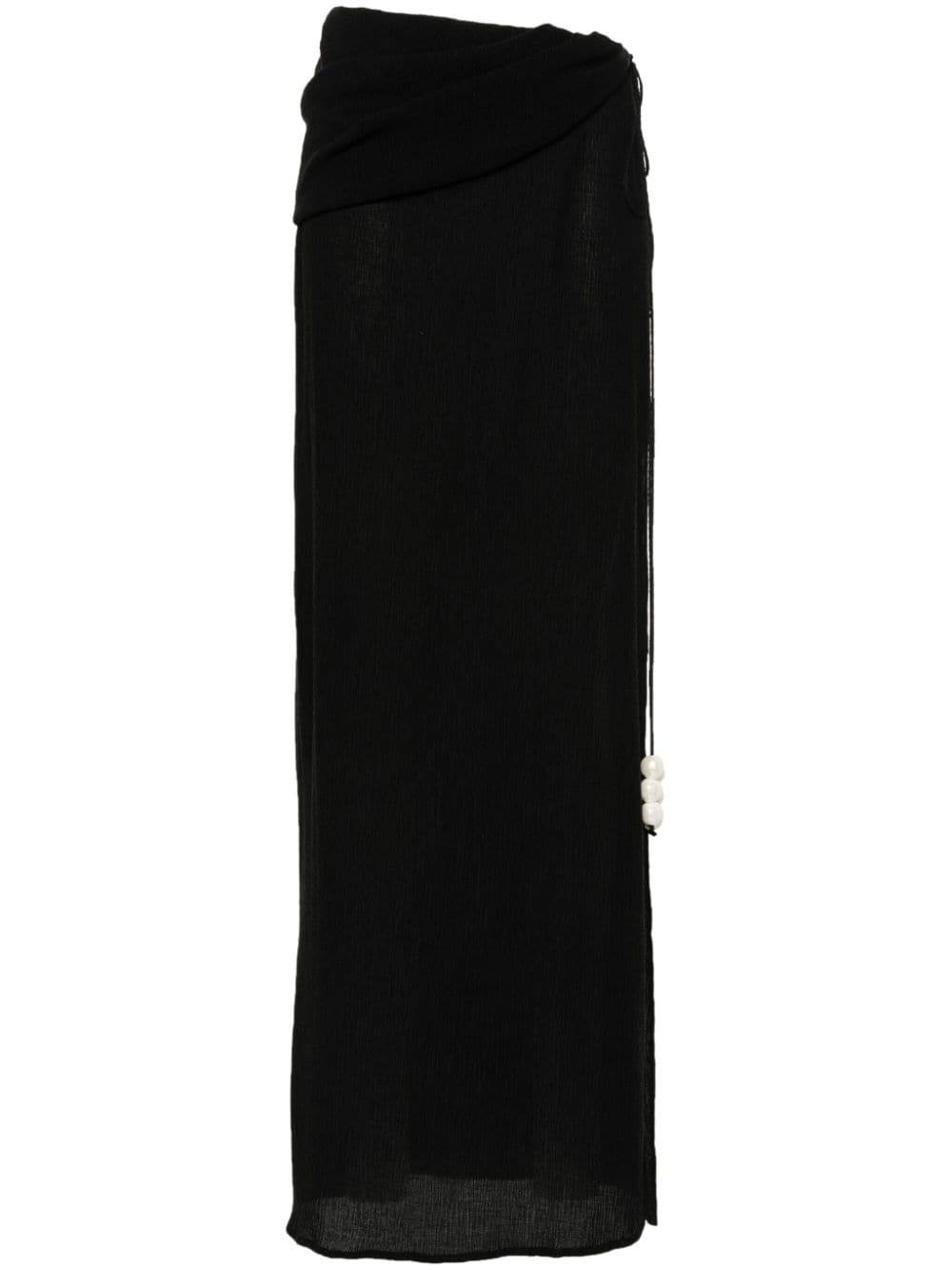 asymmetric-design skirt Highlights - Black - Textured finish - Semi-sheer construction - Layered design - Draped design - Wrap design - Open side - Side tie fastening Imported Composition Lyocell 59%, Polyester 40%, Spandex/Elastane 1% SIZE & FIT Model measurements Height 5 ft 9 in(1.76 m) Bust/Chest 31.1 in(79 cm) Hips 36.61 in(93 cm) Waist 24.8 in(63 cm) Measurement HIPS 32.28 in(82 cm) LENGTH 43.7 in(111 cm) WAIST 26.77 in(68 cm) FittingInformation This maxi-length skirt is intended to be worn just below the waist The tie fastening gives an adaptable and personalised fit Made from a midweight stretch fabric, this piece offers elasticity and flexibility when worn This piece fits true to size – take your usual size