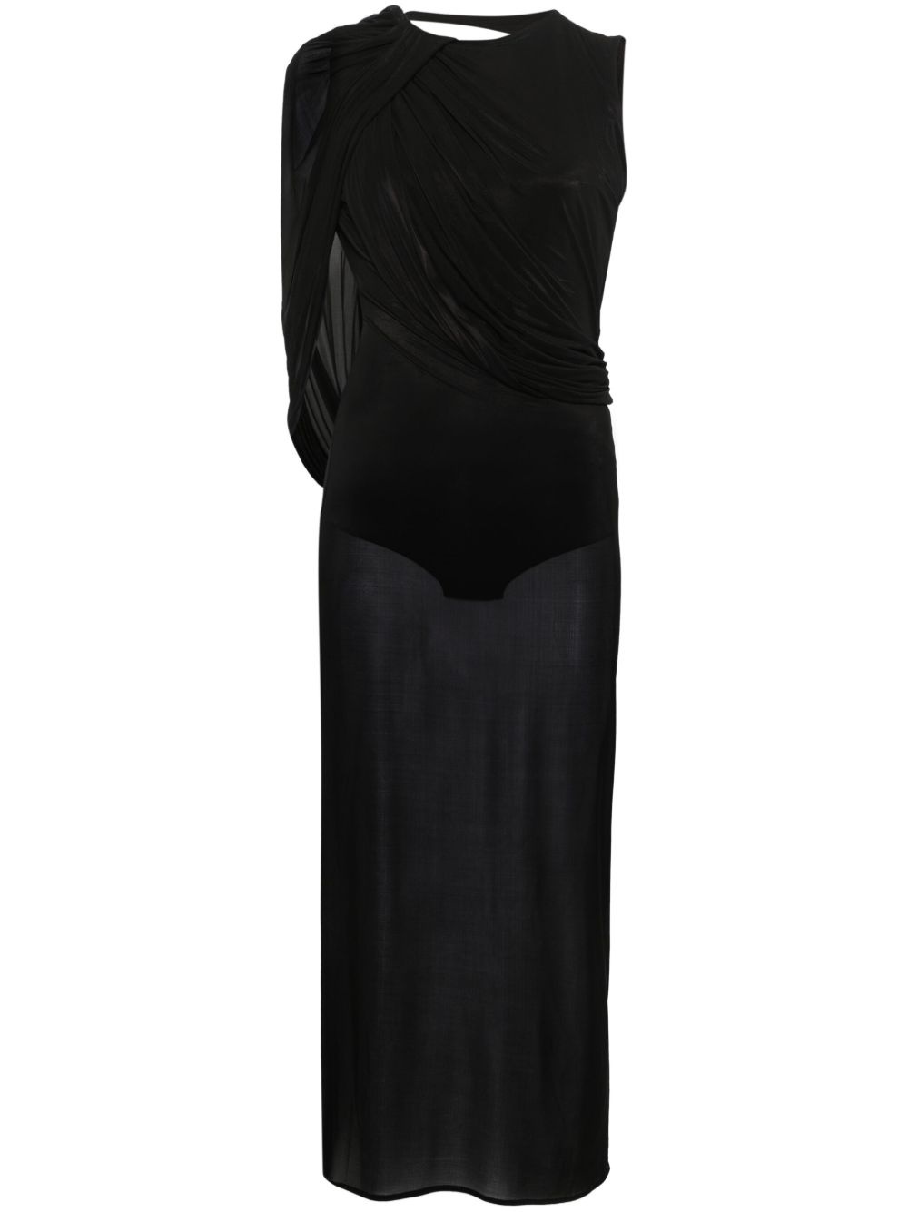 asymmetric draped midi dress Highlights - Black - Button fastening - Ruched detailing - Partial lining Imported Composition Cupro 92%, Elastane 8% SIZE & FIT Model measurements Height 5 ft 11 in(1.8 m) Bust/Chest 31.49 in(80 cm) Hips 36.61 in(93 cm) Waist 24.4 in(62 cm) FittingInformation Designed for a close fit throughout Made from a midweight stretch fabric, this piece offers elasticity and flexibility when worn