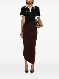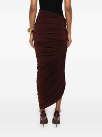 asymmetric maxi skirt Highlights - Bordeaux red - Elasticated waistband - Draped detailing - Gathered detailing Imported Composition Viscose 83%, Polyamide 11%, Elastane 6% SIZE & FIT Model measurements Height 5 ft 11 in(1.8 m) Bust/Chest 31.49 in(80 cm) Hips 35.82 in(91 cm) Waist 24.8 in(63 cm) FittingInformation Designed with an asymmetric hem, this skirt is intended to be worn just below the waist The elasticated waist allows for a comfortable fit Made from a lightweight stretch fabric, this piece offers elasticity and flexibility when worn Washing instructions Dry Clean Only