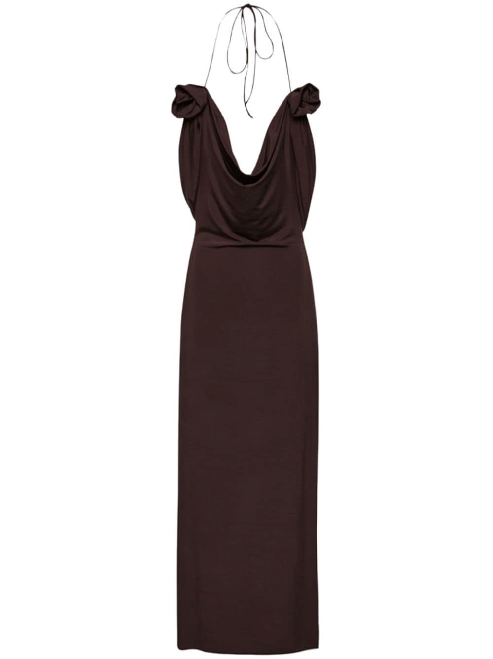 Cowl-neck dress Highlights - Chocolate brown - Stretch-design - Jersey texture - Shift style - Cowl neck - Rear tie fastening - Halterneck - Draped back - Side slits - Ankle-length Imported Composition Viscose 88%, Elastane 12%