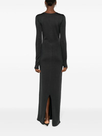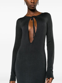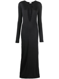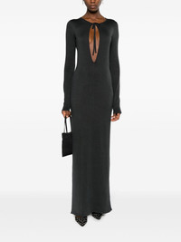 cut-out silk maxi dress Magda Butrym’s maxi dress is a sleek offering. Imagined in a dark-grey hue, it’s cut from silk to a slinky silhouette punctuated with a teardrop-shaped cut-out at the front. Highlights - Dark grey - Silk - Cut-out detailing - Round neck - Front tie fastening - Long sleeves - Rear slit - Floor-length - Straight hem Made in Italy Composition Silk 100% SIZE & FIT Model measurements Height 5 ft 10 in(1.78 m) Bust/Chest 31.49 in(80 cm) Hips 37 in(94 cm) Waist 23.62 in(60 cm) Measurement HIPS 35.43 in(90 cm) LENGTH 55.51 in(141 cm) WAIST 25.98 in(66 cm) FittingInformation Designed for a slim fit that sits just away from the body offering a close yet comfortable fit Particularly long in length; consider your own measurements Made with a lightweight knit, this piece offers some stretch This piece fits true to size – take your usual size Washing instructions Dry Clean Only