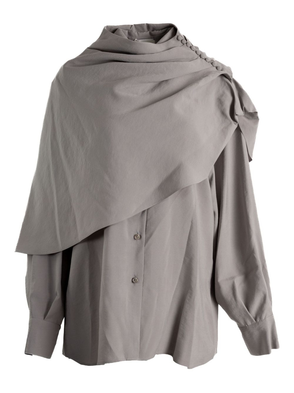 draped-collar shirt Highlights - Grey - Draped collar - Button fastening - Long sleeves - Buttoned cuffs - Asymmetrical detail Imported Composition Fabric 100% Washing instructions Read Manufacturer Guidelines