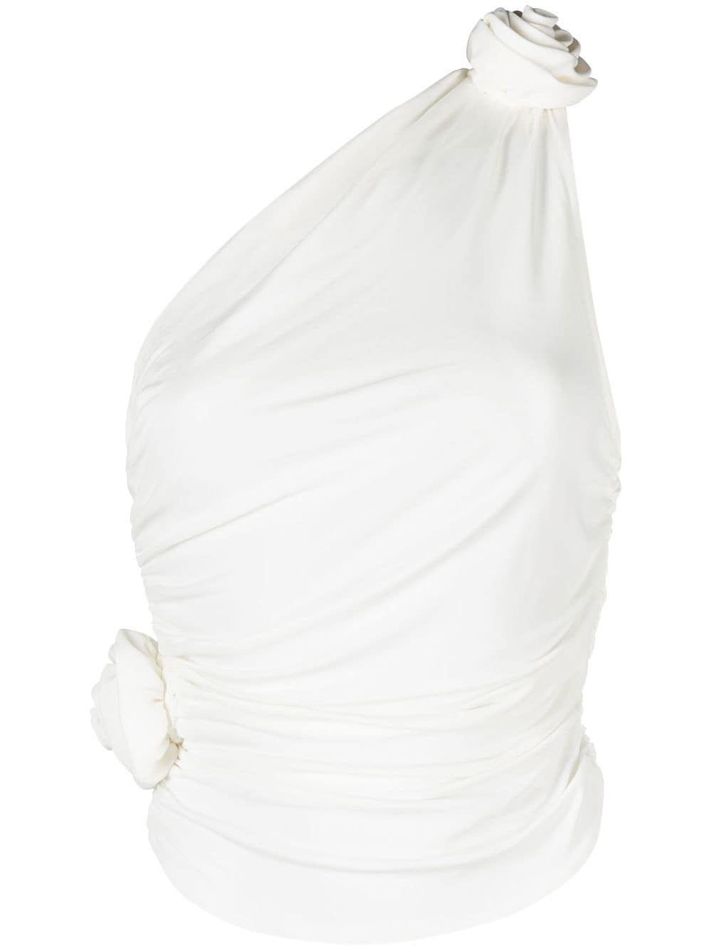draped one-shoulder top white stretch-design draped design 3D detailing one-shoulder sleeveless Imported Composition Viscose 97%, Spandex/Elastane 3% SIZE & FIT Model measurements Height 5 ft 10 in(1.78 m) Bust/Chest 29.92 in(76 cm) Hips 34.64 in(88 cm) Waist 23.62 in(60 cm) Measurement CHEST 29.92 in(76 cm) HIPS 26.77 in(68 cm) LENGTH 18.11 in(46 cm) FittingInformation This piece fits true to size. We recommend you get your regular size Cut for a slim fit Made with a mid-weight stretch fabric Washing instructions Dry Clean Only