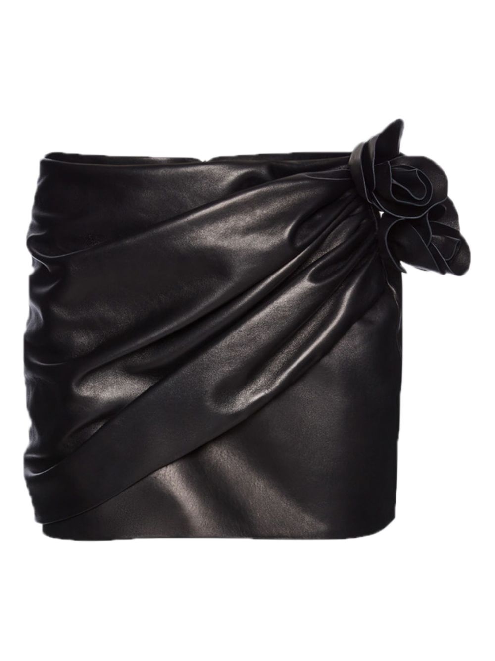 floral-applique leather mini skirt Highlights - Black - Rear zip fastening - Gathered detailing - Draped design Imported Composition Calf Leather 100%