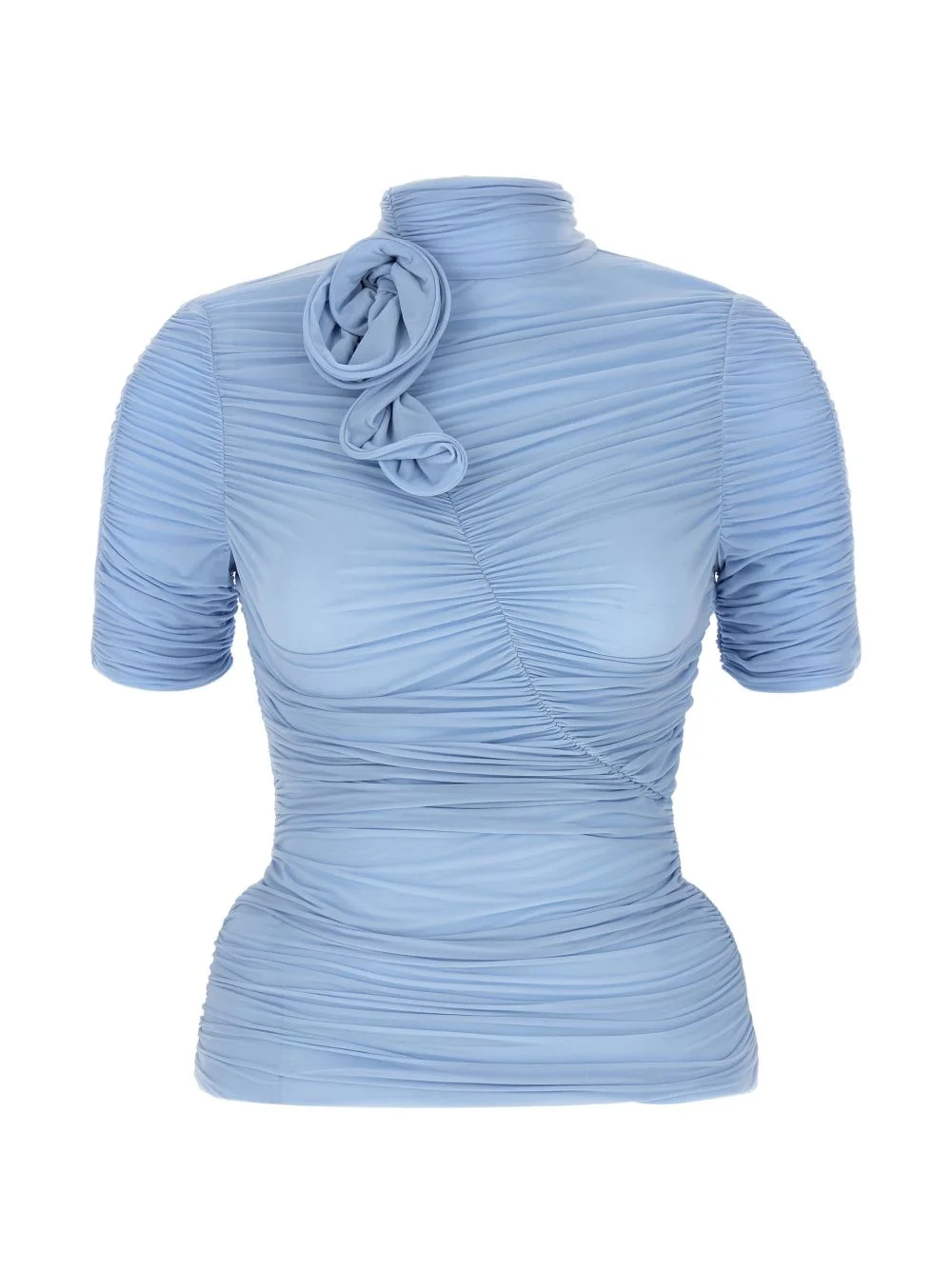 floral curl silk top Highlights - Light blue - Diagonal stitching - 3d floral decoration - High neck - Short sleeves - Back zip fastening Imported Composition Silk 92%, Spandex/Elastane 8% Washing instructions Dry Clean Only
