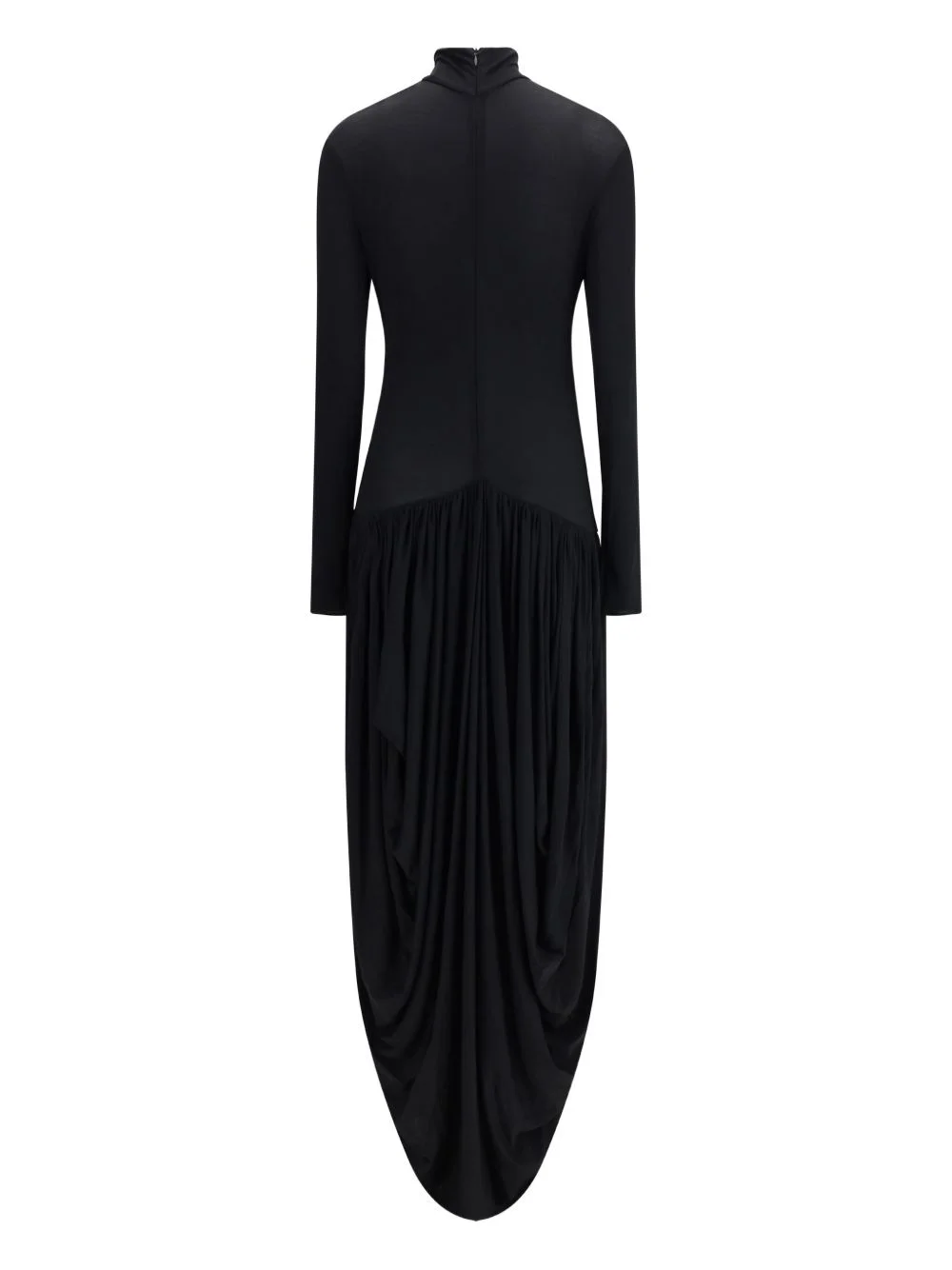high-neck draped dress Highlights - Black - High neck - Long sleeves - Fitted bodice - Gathered skirt - Draped hem Imported Composition Fabric 100% Washing instructions Read Manufacturer Guidelines