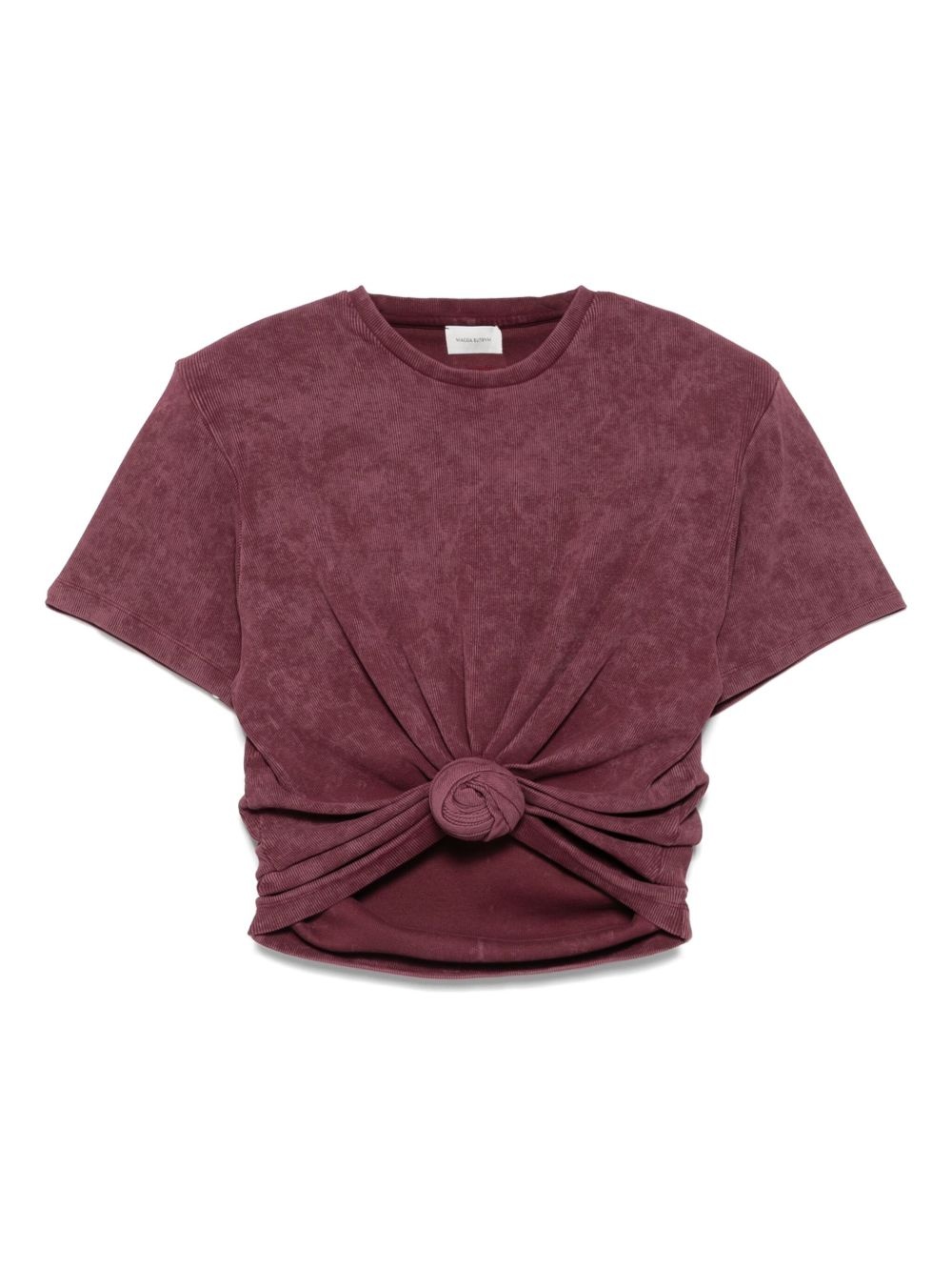 knotted round-neck t-shirt Highlights - Purple - Short sleeves - Round neck - Knotted front Imported Composition Cotton 95%, Elastane 5% SIZE & FIT Model measurements Height 5 ft 10 in(1.78 m) Bust/Chest 31.49 in(80 cm) Hips 37 in(94 cm) Waist 23.62 in(60 cm) FittingInformation Designed for a relaxed fit, this piece allows for comfort and movement when worn The internal shoulder pads offer a structured shape Made from a midweight stretch fabric, this piece offers elasticity and flexibility when worn Washing instructions Machine Wash