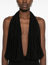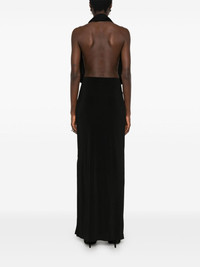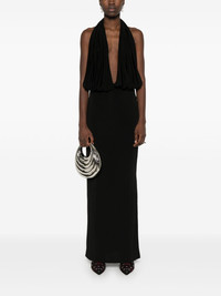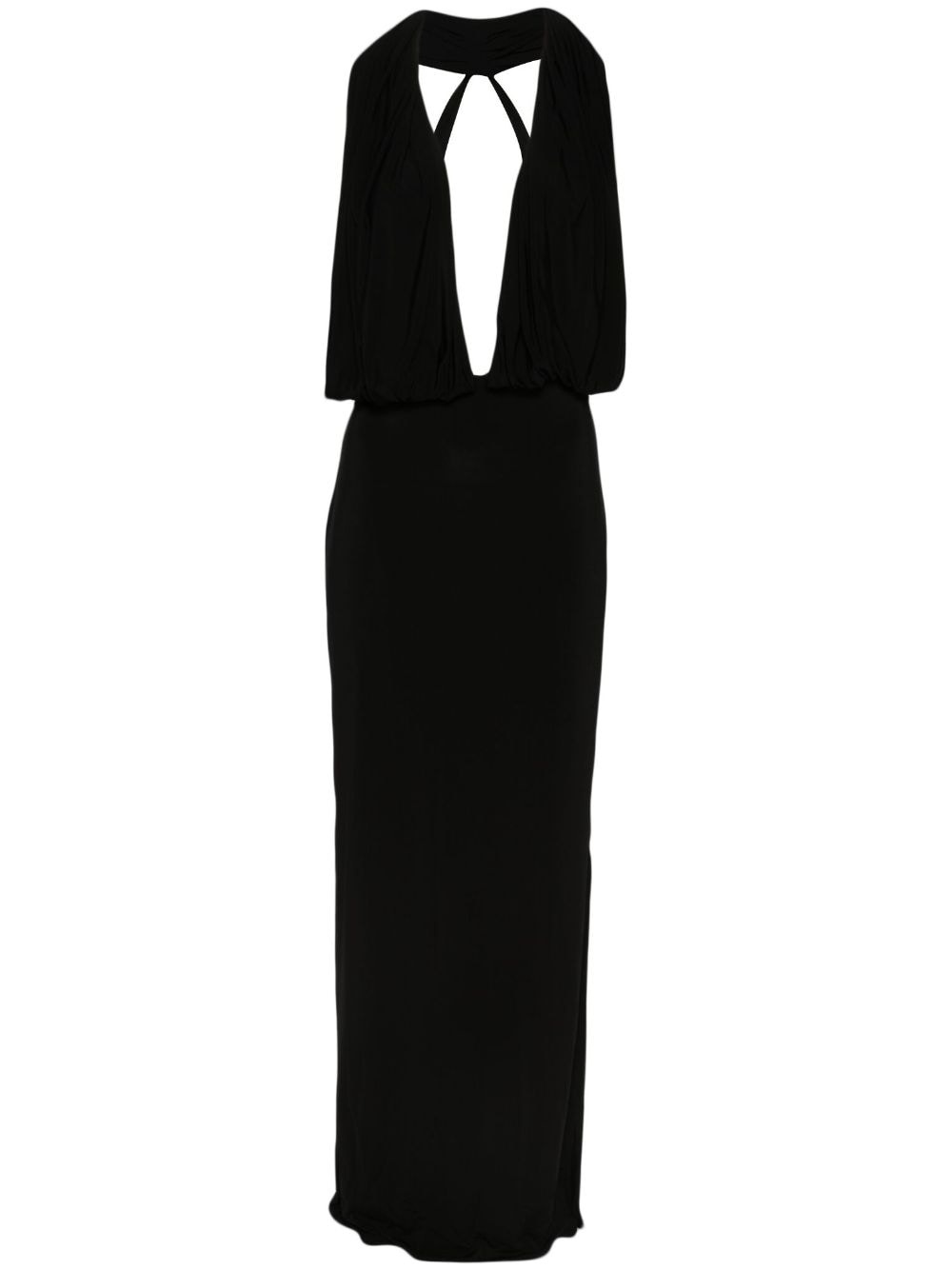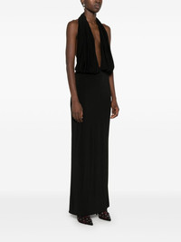 open-back jersey gown Highlights - Black - Stretch-jersey - Halterneck - Layered plunging v-neck - Gathered detailing - Sleeveless - Elasticated underband - Side slit - Full-length - Open back - Straight hem - Pull-on style Imported Composition Viscose 88%, Elastane 12% SIZE & FIT Model measurements Height 5 ft 11 in(1.8 m) Bust/Chest 32.67 in(83 cm) Hips 36.22 in(92 cm) Waist 24.4 in(62 cm) FittingInformation Designed for a loose fit at the chest with a close fit over the waist and hips Made from a midweight stretch fabric, this piece offers elasticity and flexibility when worn This piece fits true to size – take your usual size