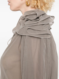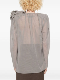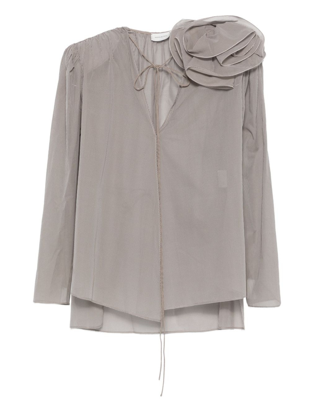 rose-embellishment blouse Highlights - Brown - Rose embellishment - Tie fastening - V-neck - Long sleeves - Checked pattern - Padded shoulders Imported Composition Silk 100% SIZE & FIT Model measurements Height 5 ft 9 in(1.75 m) Bust/Chest 34.64 in(88 cm) Hips 36.61 in(93 cm) Waist 26.37 in(67 cm) Washing instructions Read Manufacturer Guidelines