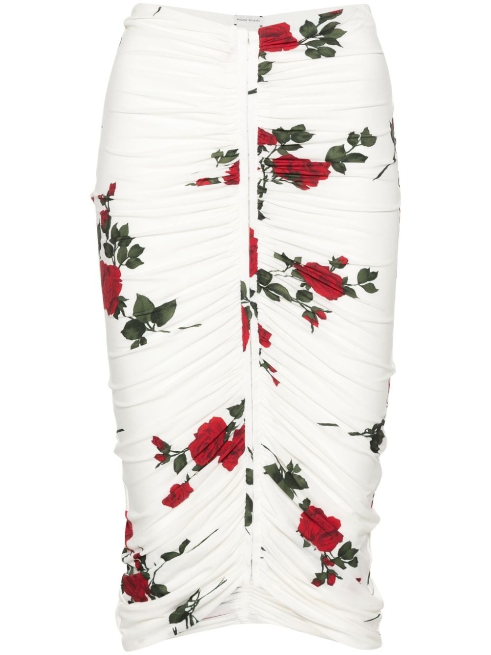 rose-print ruched midi skirt Highlights - White - Stretch-design - Rose print - Ruched detailing - Curved hem - Full lining - Rear hook and eye fastening Imported Composition Polyamide 87%, Elastane 13% SIZE & FIT Model measurements Height 5 ft 10 in(1.77 m) Bust/Chest 29.92 in(76 cm) Hips 34.25 in(87 cm) Waist 23.62 in(60 cm) FittingInformation This midi-length skirt is intended to be worn high on the waist Made from a lightweight stretch fabric, this piece offers elasticity and flexibility when worn This piece fits true to size – take your usual size Washing instructions Dry Clean Only