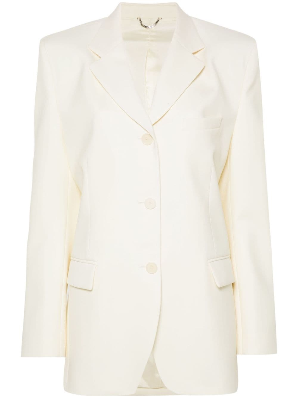 single-breasted blazer Highlights - Cream white - Wool-silk blend - Notched lapels - Shoulder pads - Buttoned cuffs - Chest welt pocket - Dart detailing - Two side flap pockets - English rear vents - Multiple internal slip pockets - Silk lining - Straight hem - Front button fastening Imported Composition Outer: Wool 70%, Silk 30% Lining: Silk 100% SIZE & FIT Model measurements Height 5 ft 10 in(1.78 m) Bust/Chest 31.49 in(80 cm) Hips 37 in(94 cm) Waist 23.62 in(60 cm) FittingInformation Designed for a boxy fit, intended for a loose fit throughout The internal shoulder pads offer a structured shape Made from a midweight non-stretch fabric This piece fits true to size – take your usual size